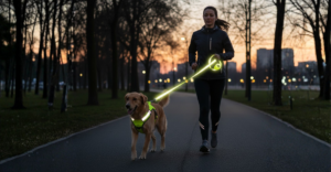 Reflective leashes and harnesses for pets keep dogs visible and safe during early morning or evening walks and runs.
